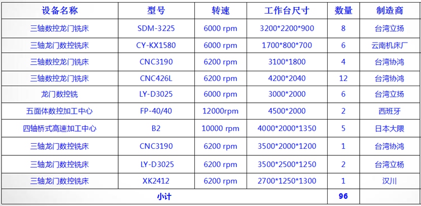 The company has 96 processing equipment including Italian high-speed five-axis CNC machining center, Japanese Okuma B-Ⅱ gantry five-sided machining center, Spanish high-speed gantry five-sided machining center, etc.